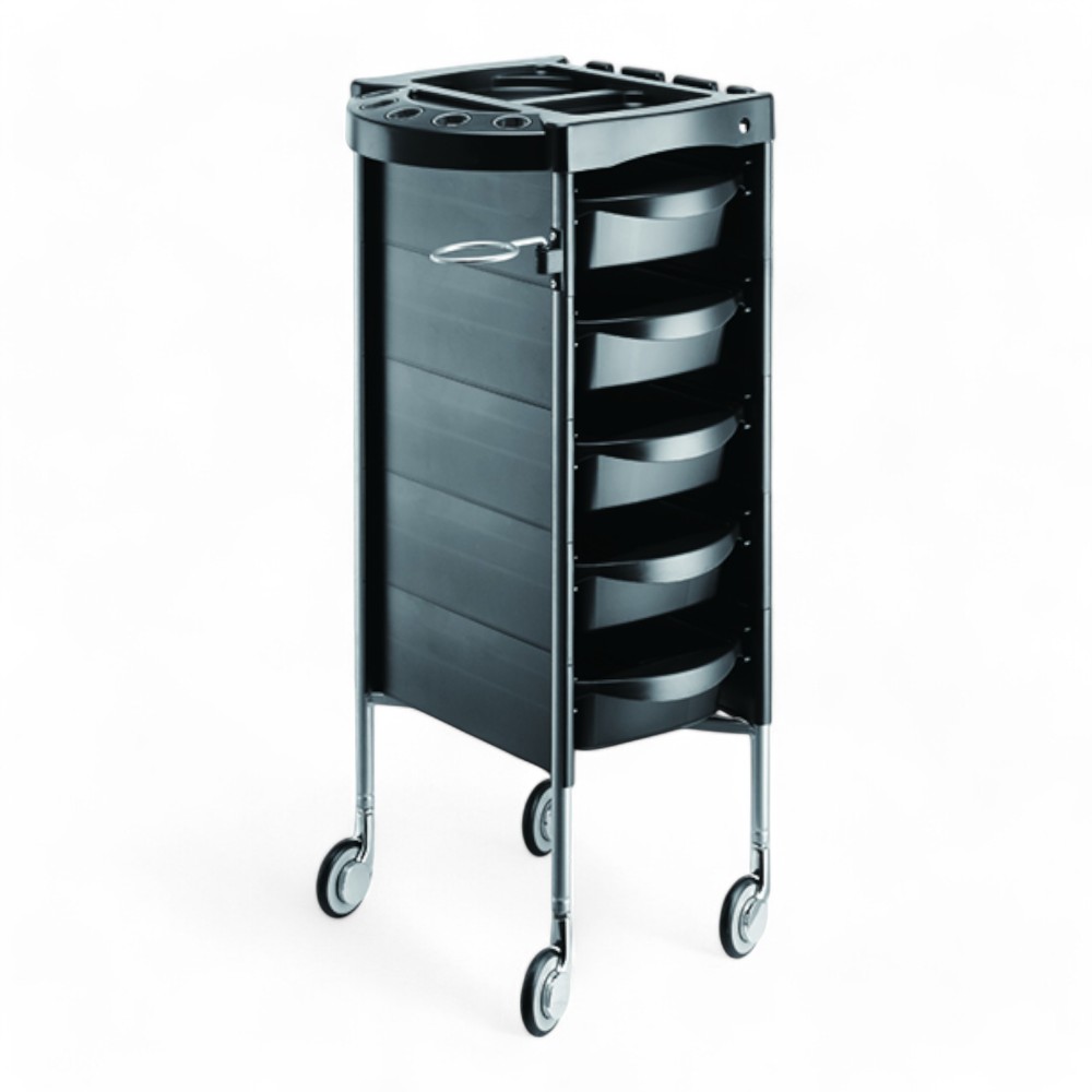 Il carrello SLIM.KF in ABS nero è perfetto per saloni che cercano una soluzione di stoccaggio versatile e leggera. Con il suo design sottile e compatto, è dotato di cassetti multipli e ruote scorrevoli, garantendo una facile mobilità all'interno del salone. Ideale per tenere ordinati gli strumenti e ottimizzare lo spazio di lavoro.