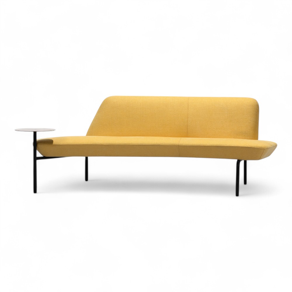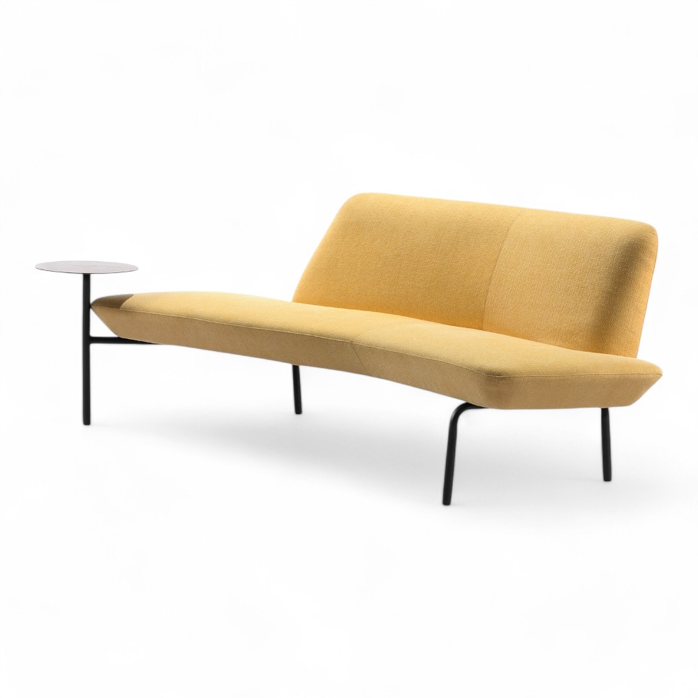 Questo modello del divano ARIA.RN, rivestito in tessuto giallo pastello, include un tavolino laterale integrato per offrire maggiore praticità. Il suo design vivace e funzionale lo rende perfetto per spazi moderni che desiderano un arredo pratico e colorato.