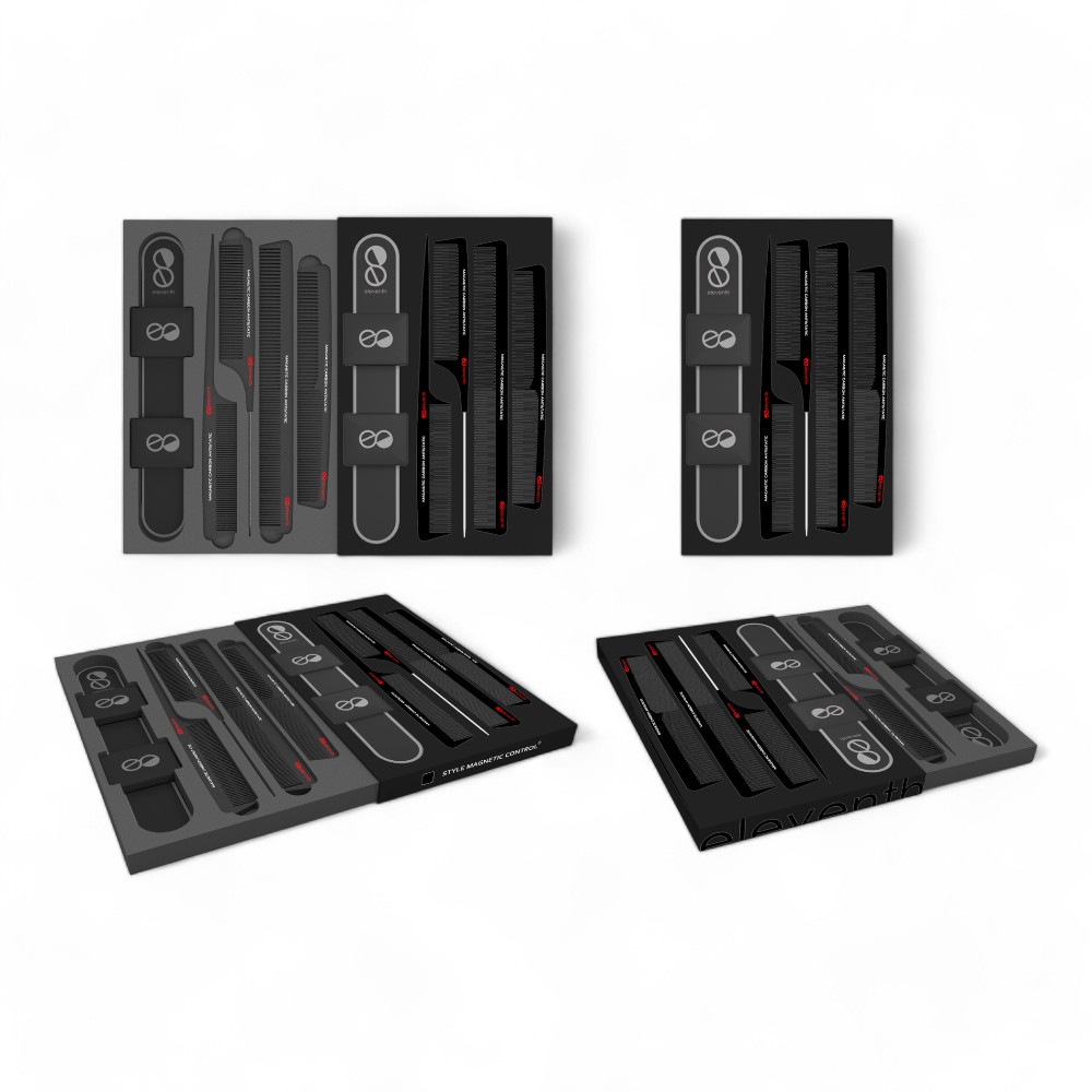 Questo kit innovativo unisce la leggerezza e la resistenza dei pettini in carbonio con la praticità di un bracciale magnetico. Grazie a questo sistema, i pettini si attaccano facilmente al bracciale, sempre a portata di mano durante il taglio. Perfetto per professionisti, offre una maggiore velocità e precisione nel lavoro, migliorando l’efficienza e la comodità in fase di styling. Colorazione nera