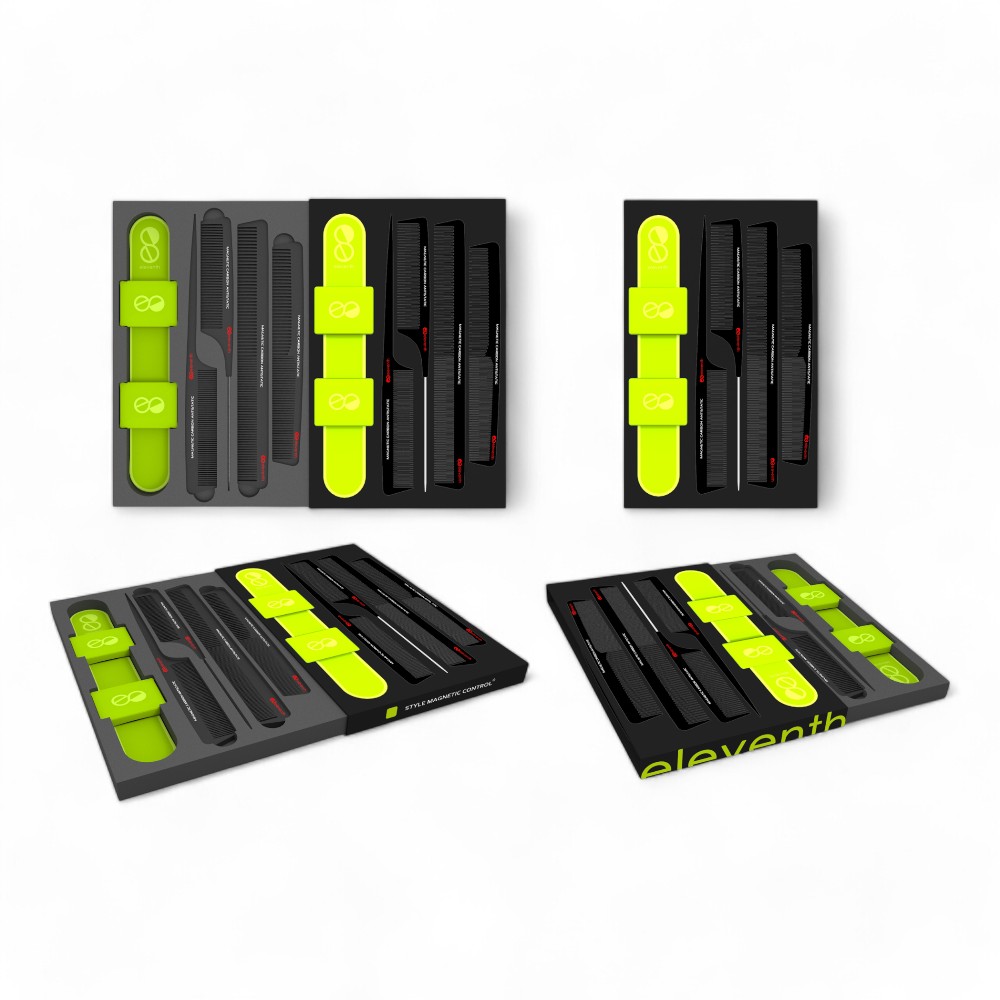 Questo kit innovativo unisce la leggerezza e la resistenza dei pettini in carbonio con la praticità di un bracciale magnetico. Grazie a questo sistema, i pettini si attaccano facilmente al bracciale, sempre a portata di mano durante il taglio. Perfetto per professionisti, offre una maggiore velocità e precisione nel lavoro, migliorando l’efficienza e la comodità in fase di styling. Colorazione Verde
