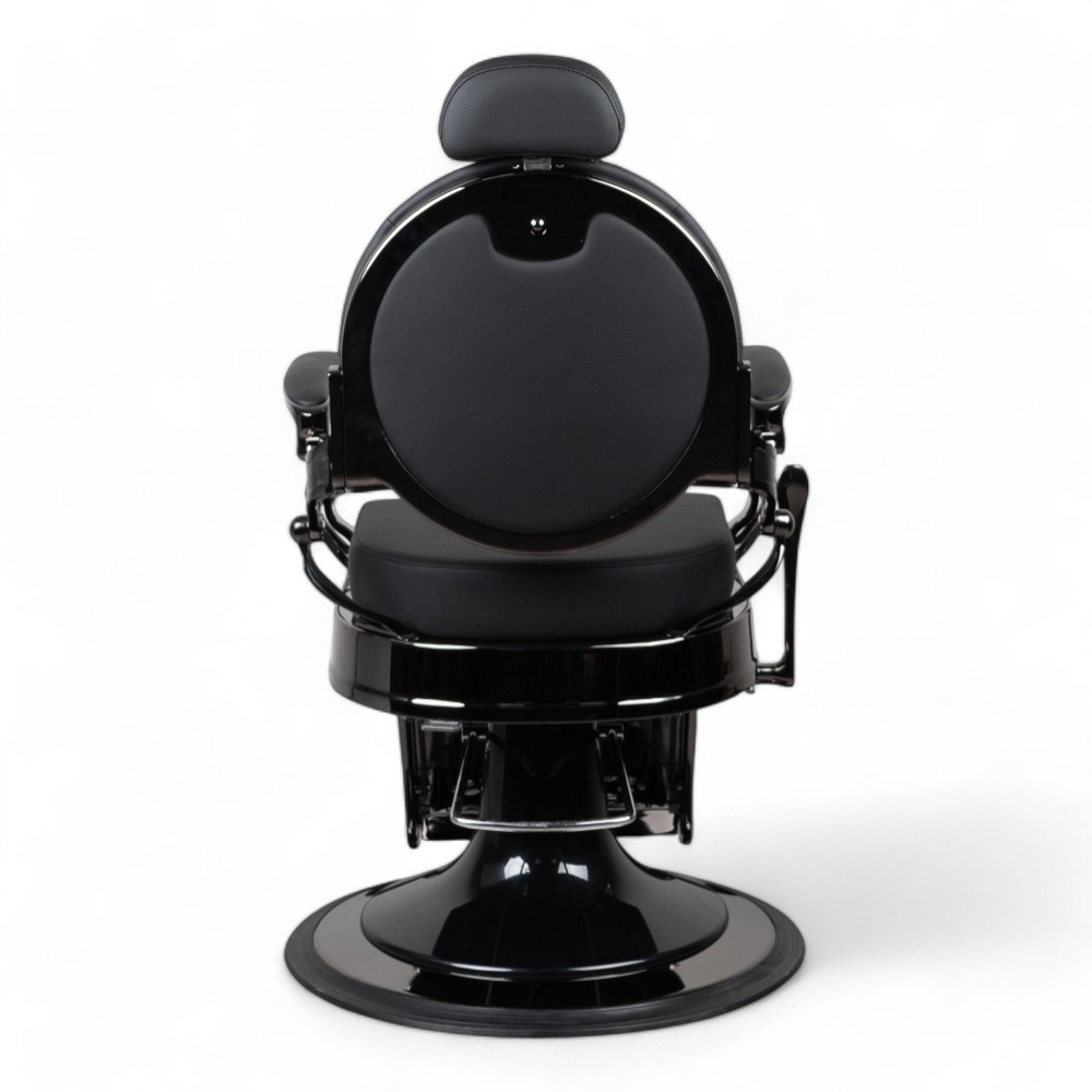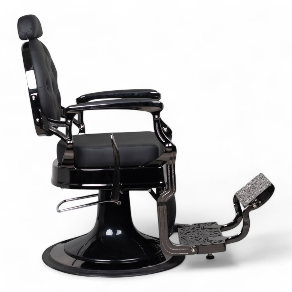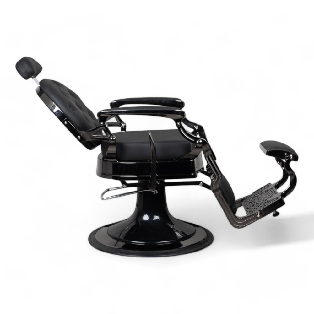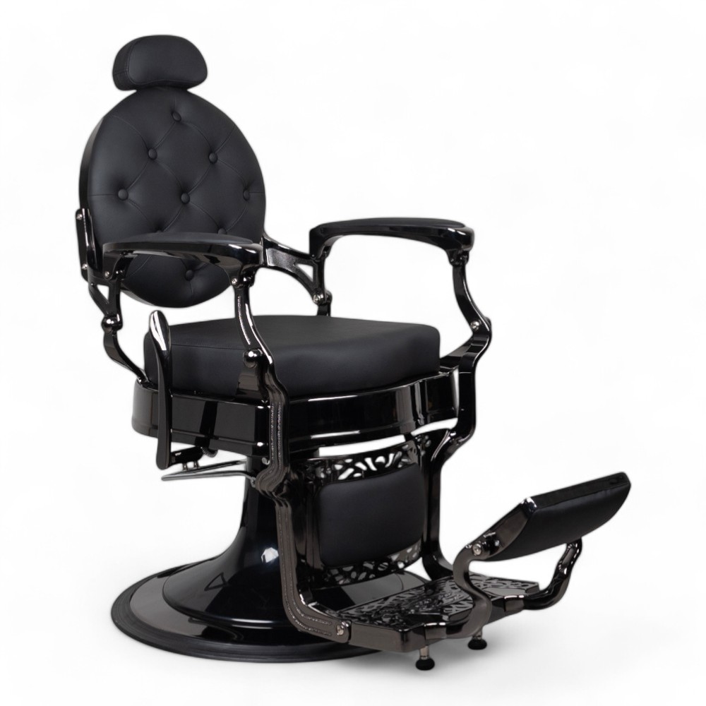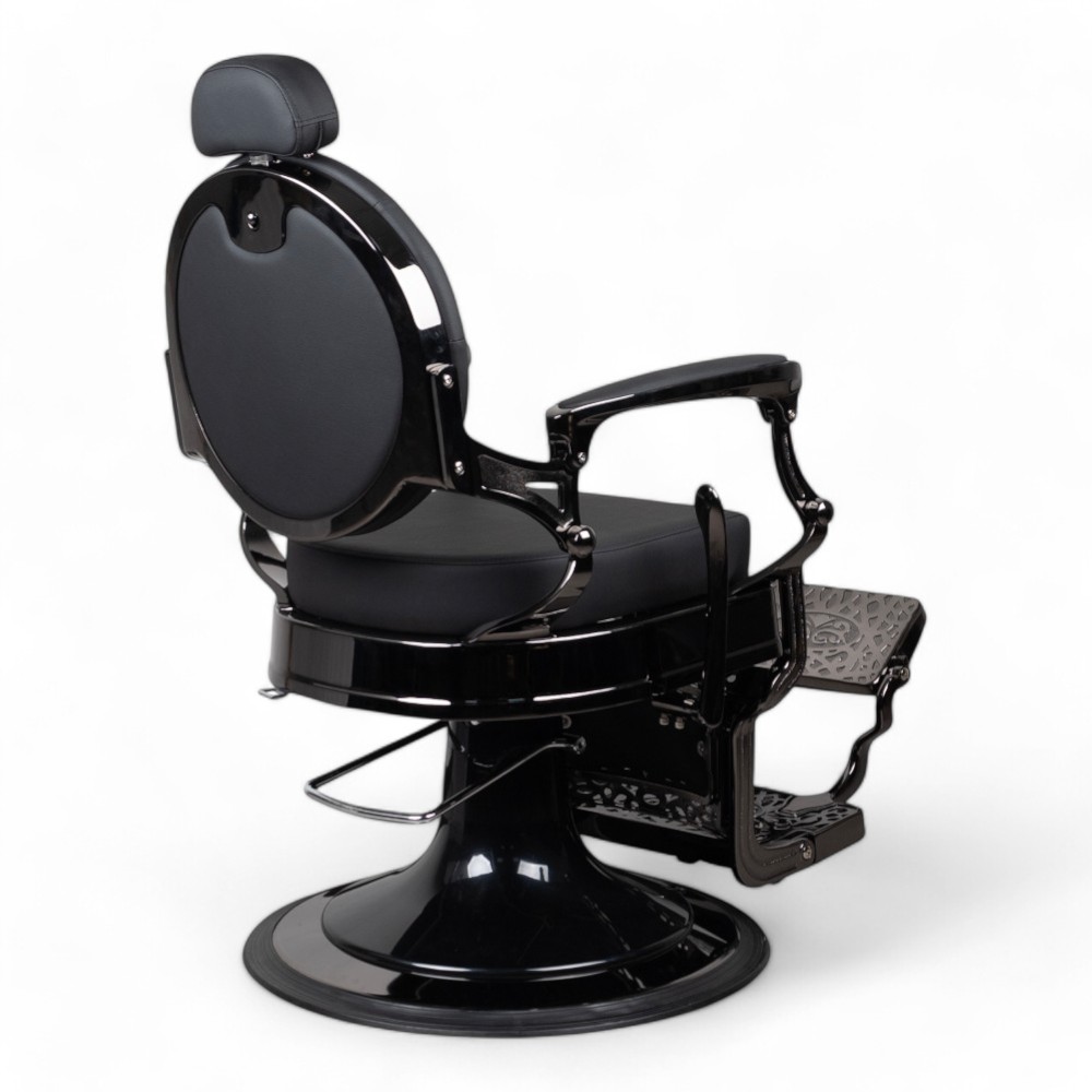 La poltrona RONIN.FN con scocca nero cromato e rivestimento in similpelle nera combina eleganza e robustezza. Perfetta per saloni di barbiere, offre comfort e regolazione idraulica, assicurando una lunga durata e un'estetica contemporanea.