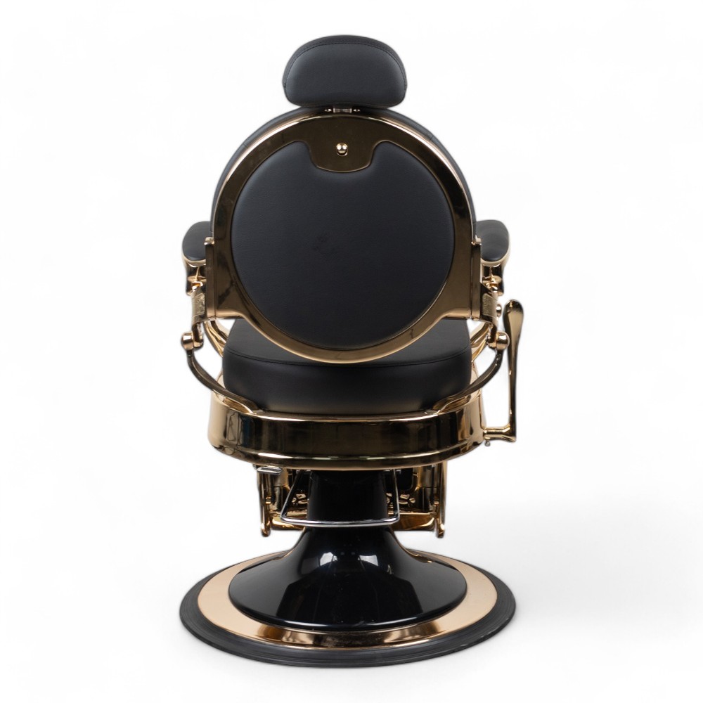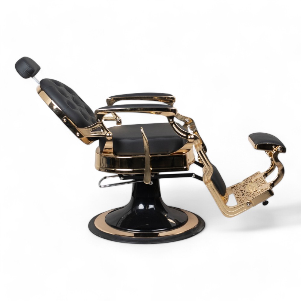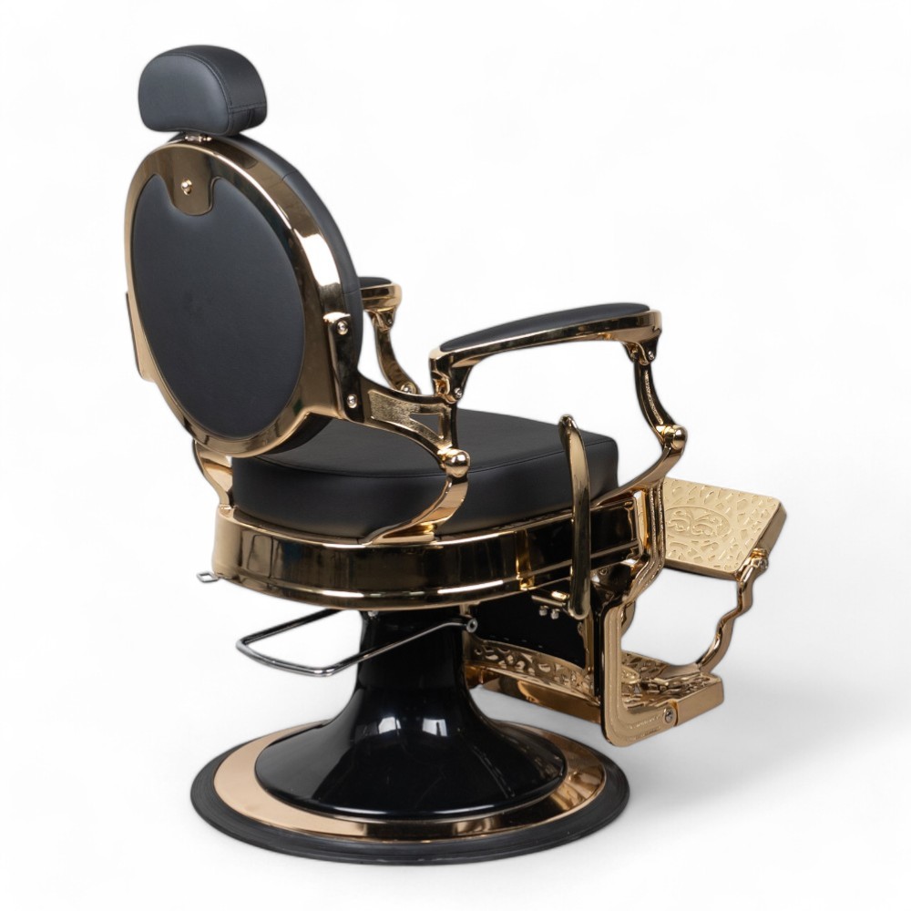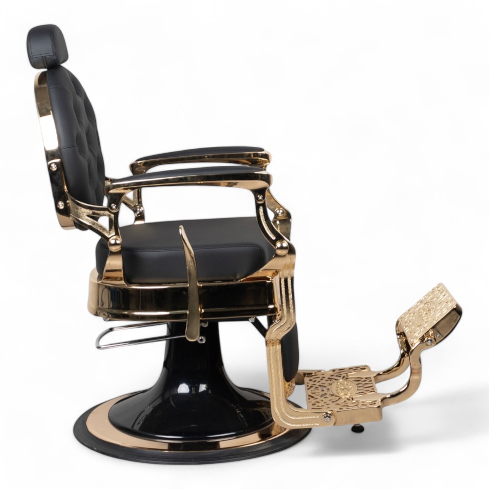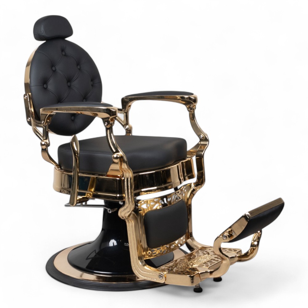 A cadeira RONIN.FN com estrutura dourada e revestimento em pele sintética preta é sinónimo de luxo e sofisticação. Perfeita para barbearias que desejam oferecer uma experiência de alto nível, esta cadeira garante conforto e um design exclusivo.