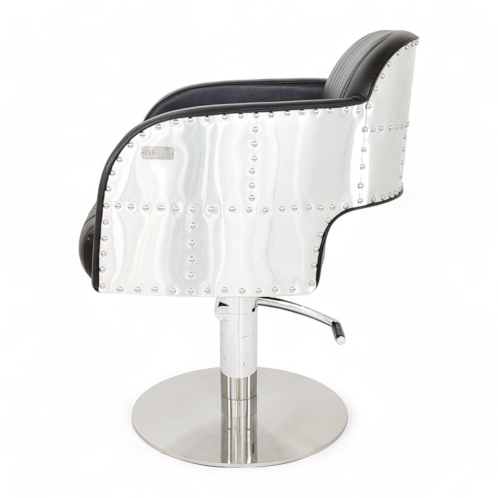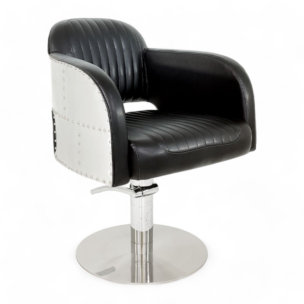 Eleganza e funzionalità si incontrano nella poltrona LAMIER.HG. Il rivestimento in similpelle nera non solo garantisce un look sofisticato, ma è anche estremamente resistente e facile da pulire. La pompa idraulica regolabile permette di adattare l'altezza della poltrona per un maggiore comfort, sia per il cliente che per il parrucchiere. Questa poltrona si adatta perfettamente a saloni moderni che cercano uno stile minimalista ma lussuoso.