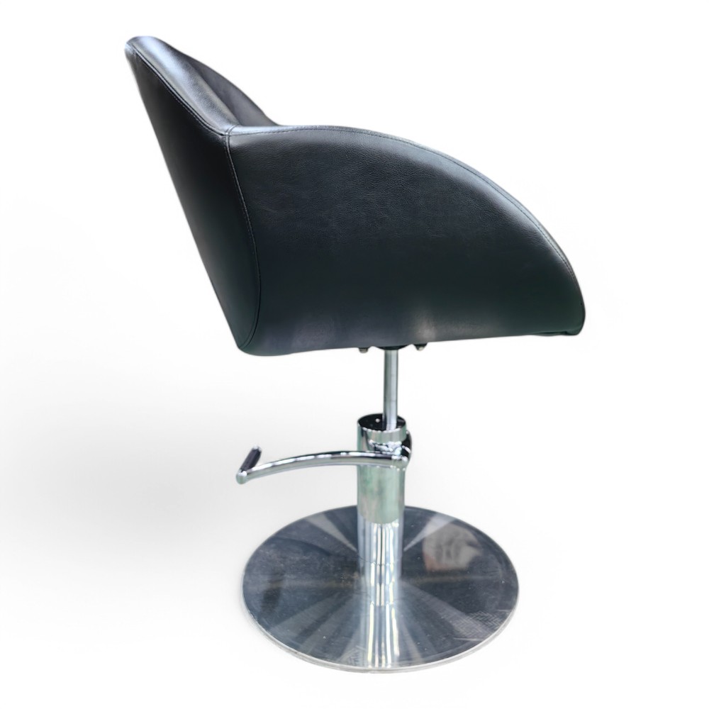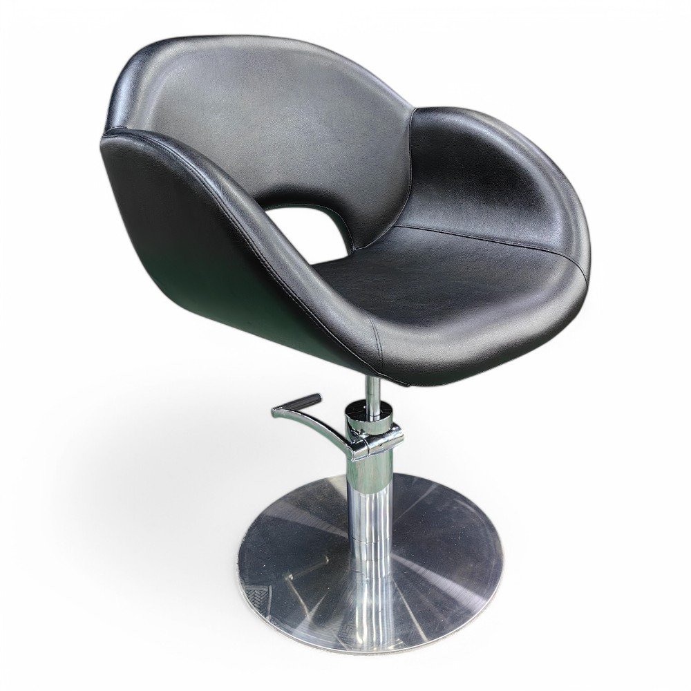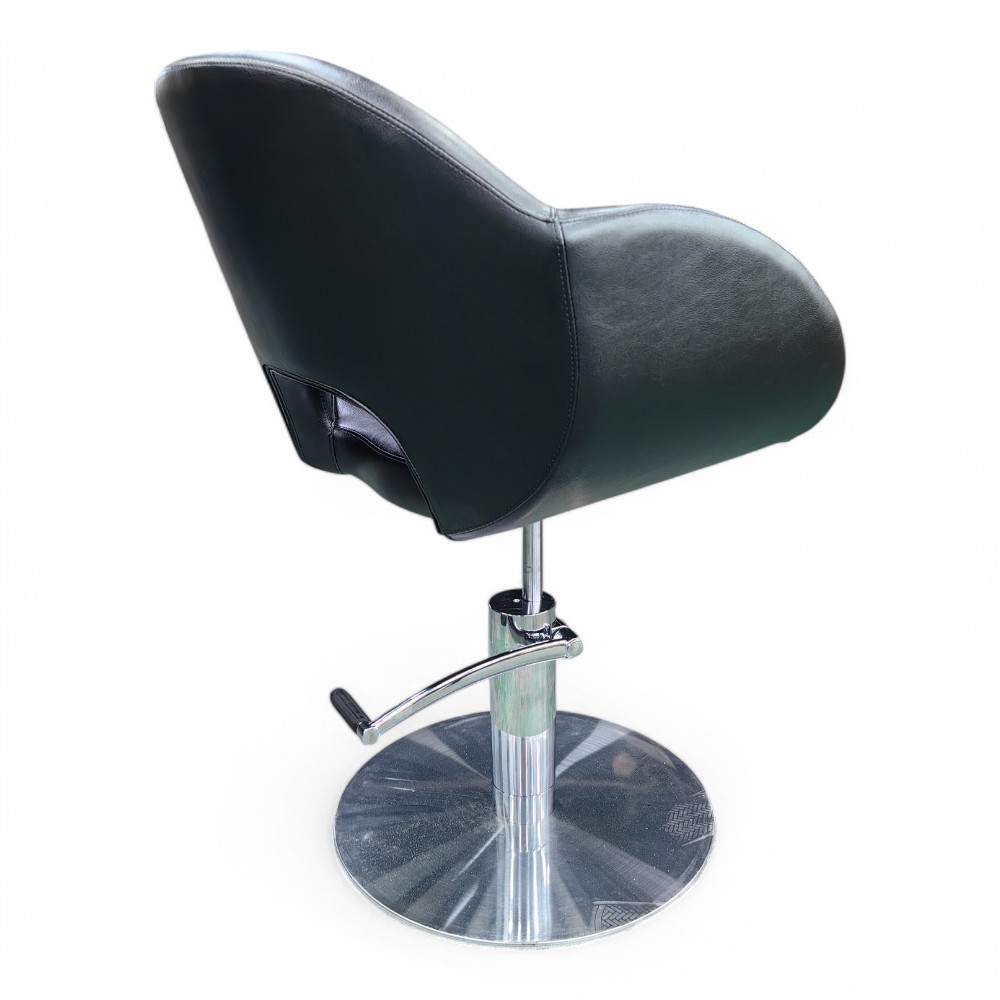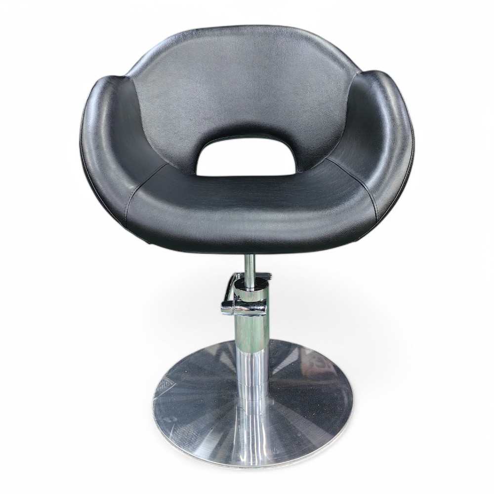 La poltrona OVOME.HG, rivestita in similpelle nera, è dotata di una pompa idraulica per la regolazione facile dell'altezza, offrendo comfort sia al cliente che all'operatore. Il design ergonomico e moderno garantisce una seduta confortevole, mentre la struttura resistente la rende ideale per un uso intensivo nei saloni di parrucchieri.
