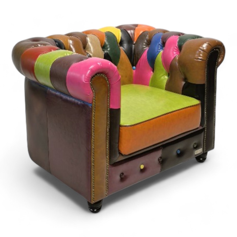 La poltrona CHEST.PR in similpelle multicolore è una scelta audace per chi cerca un arredo che catturi l'attenzione. Il suo design retrò, combinato con colori vivaci, aggiunge un elemento di divertimento e creatività in qualsiasi ambiente, pur mantenendo il classico comfort Chesterfield.