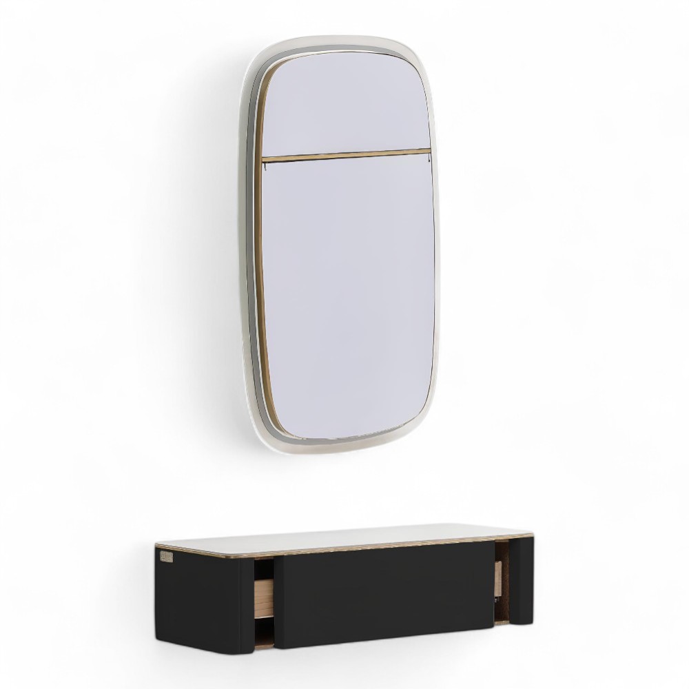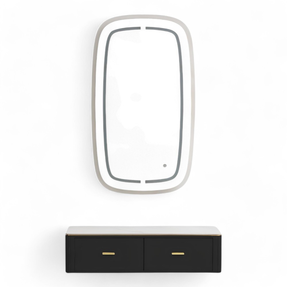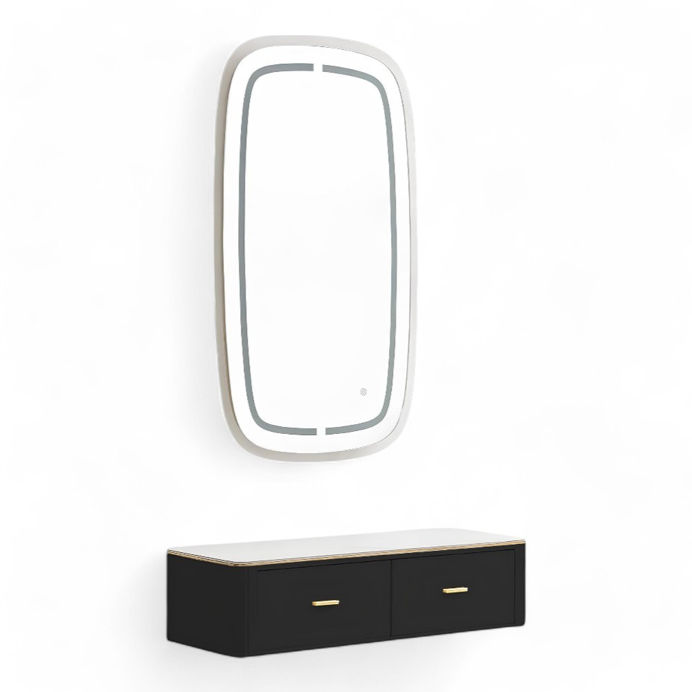 La postazione SQUIS.YC è dotata di una mensola nera con illuminazione LED e inserti argentati. Perfetta per saloni di bellezza, combina funzionalità e stile, offrendo un ampio spazio di lavoro e una luce ottimale per garantire precisione durante i trattamenti.