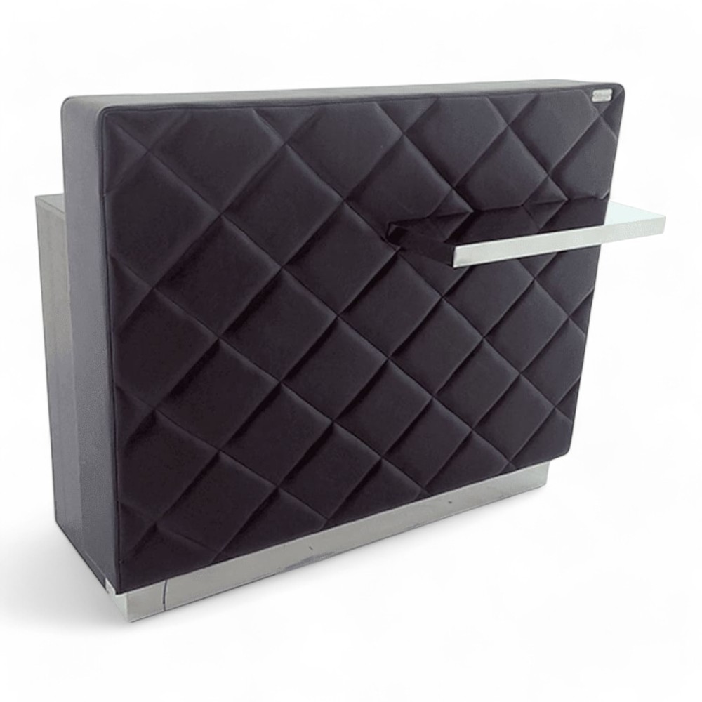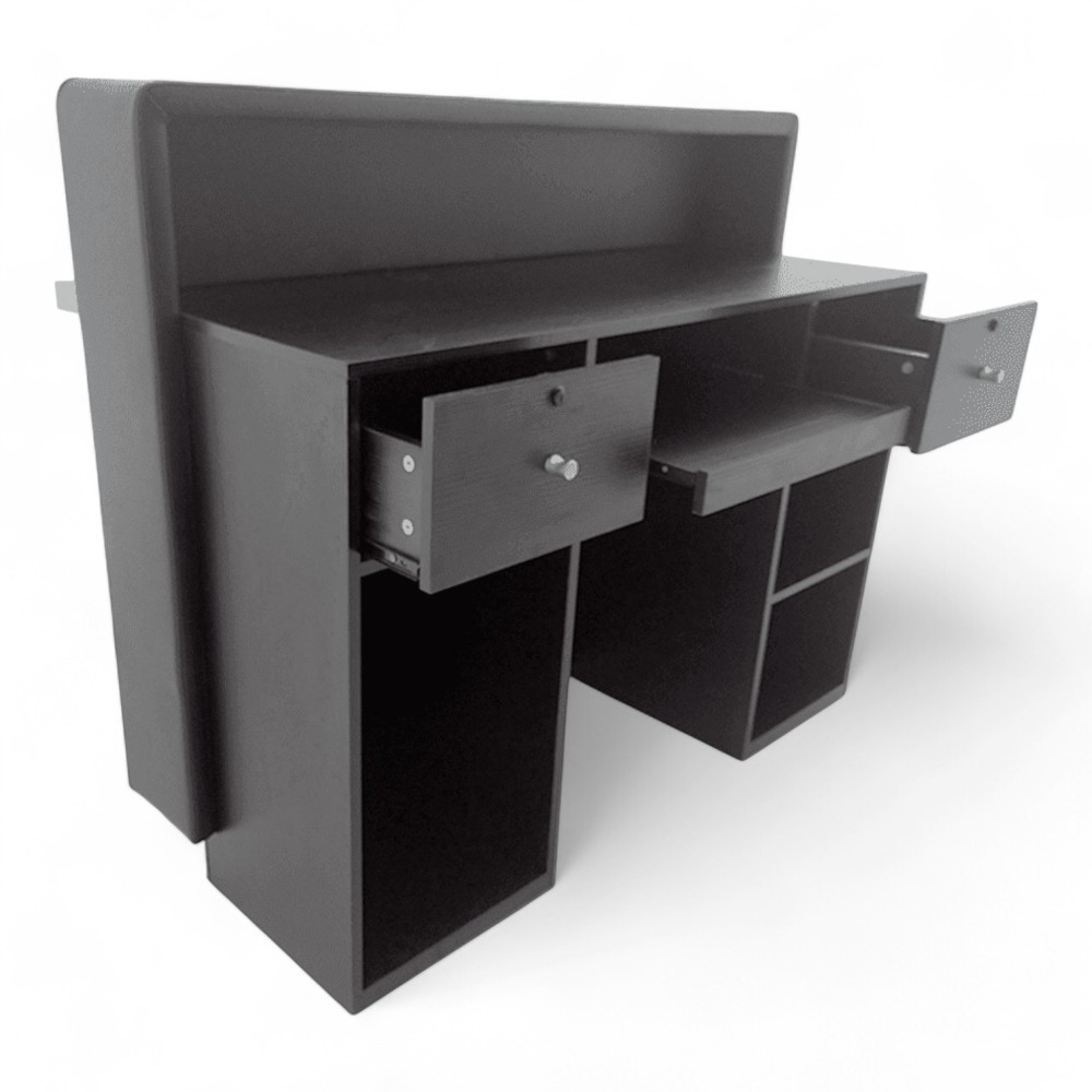 La reception DESIRE.HG si distingue per la sua eleganza e funzionalità, con un rivestimento in similpelle nera e una mensola in acciaio che aggiunge un tocco di modernità. Perfetta per saloni che desiderano un'accoglienza professionale e raffinata, offre ampio spazio per gestire i clienti e mantenere l’ordine.