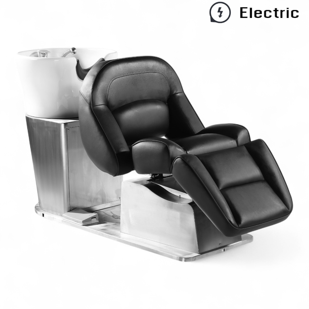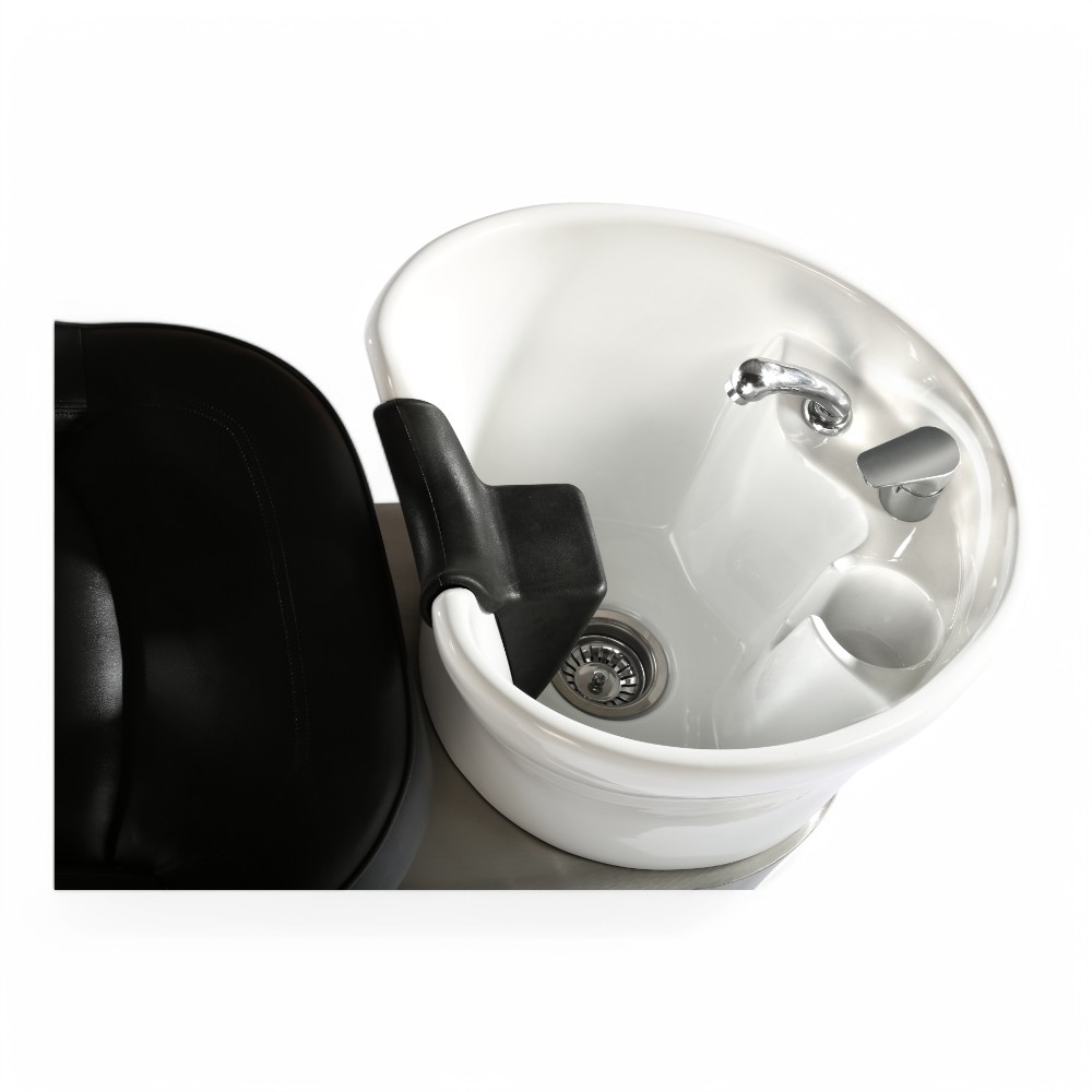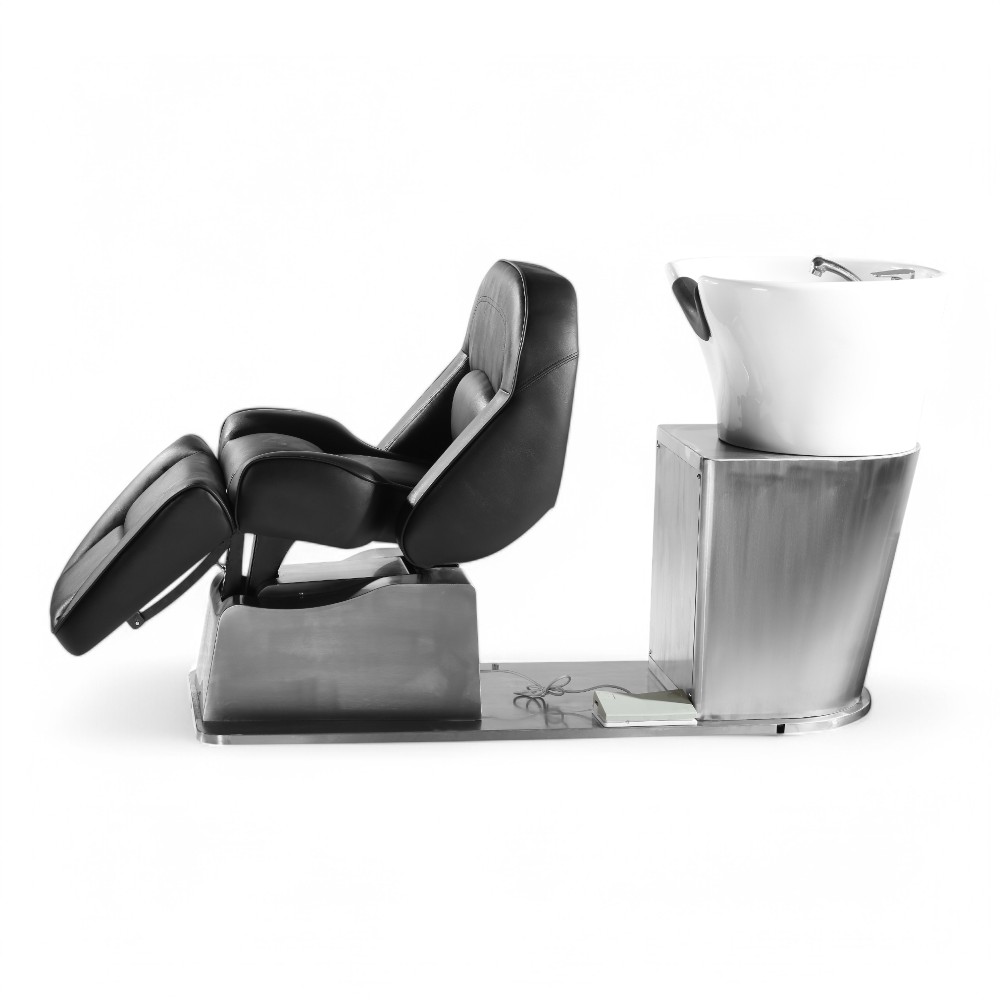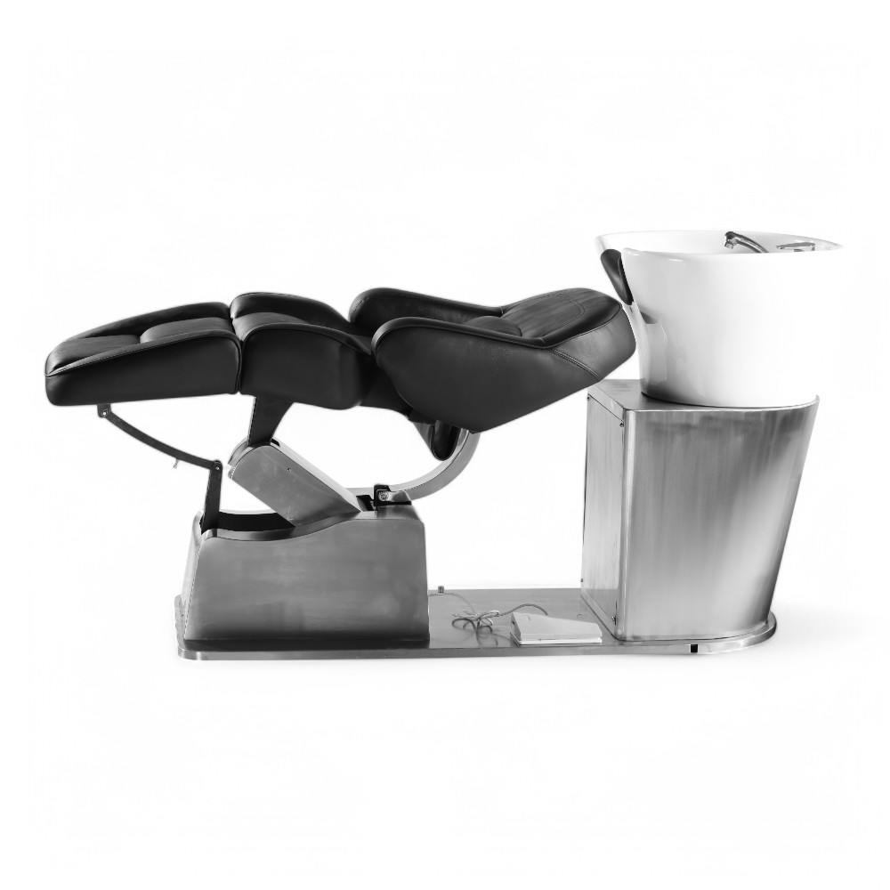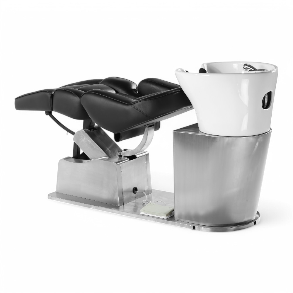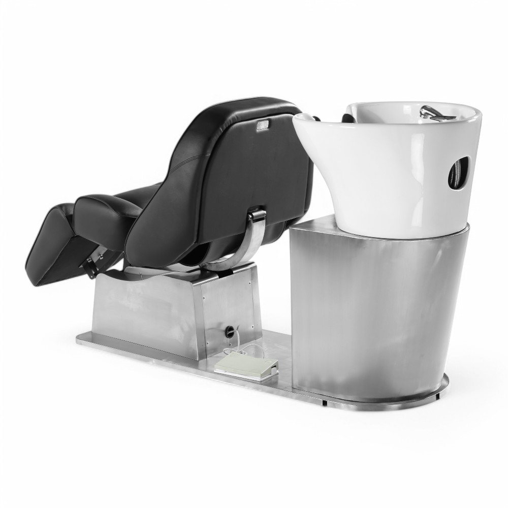 Il modello LUXOR.EM si distingue per la sua seduta ergonomica reclinabile, progettata per offrire il massimo comfort durante il lavaggio e i trattamenti dei capelli. Rivestito in similpelle nera liscia con cuciture eleganti a contrasto, questo lavatesta combina stile e funzionalità. La struttura robusta e il design moderno permettono al cliente di distendersi completamente, mentre l'ampio bacino bianco, dotato di inclinazione regolabile, garantisce praticità e facilità d'uso per l'operatore. Ideale per saloni e SPA che puntano a offrire un'esperienza rilassante e di alto livello.