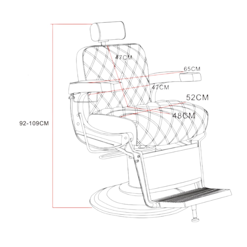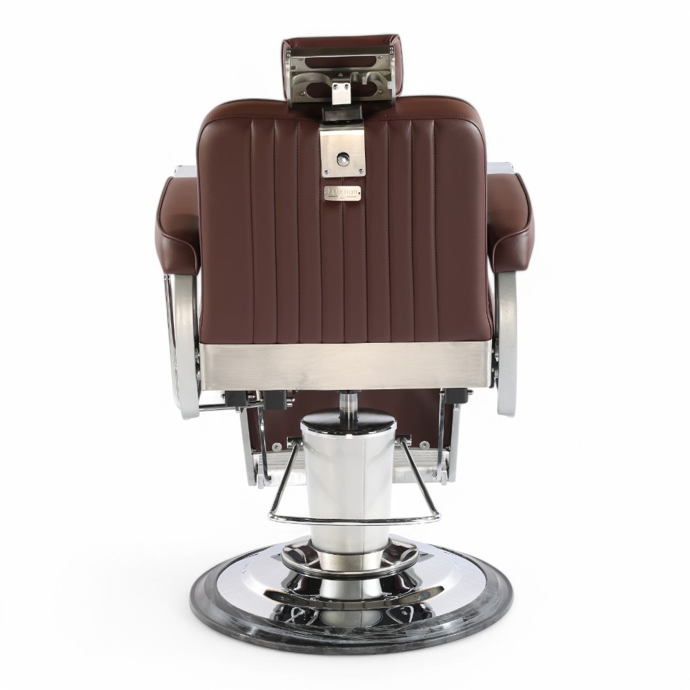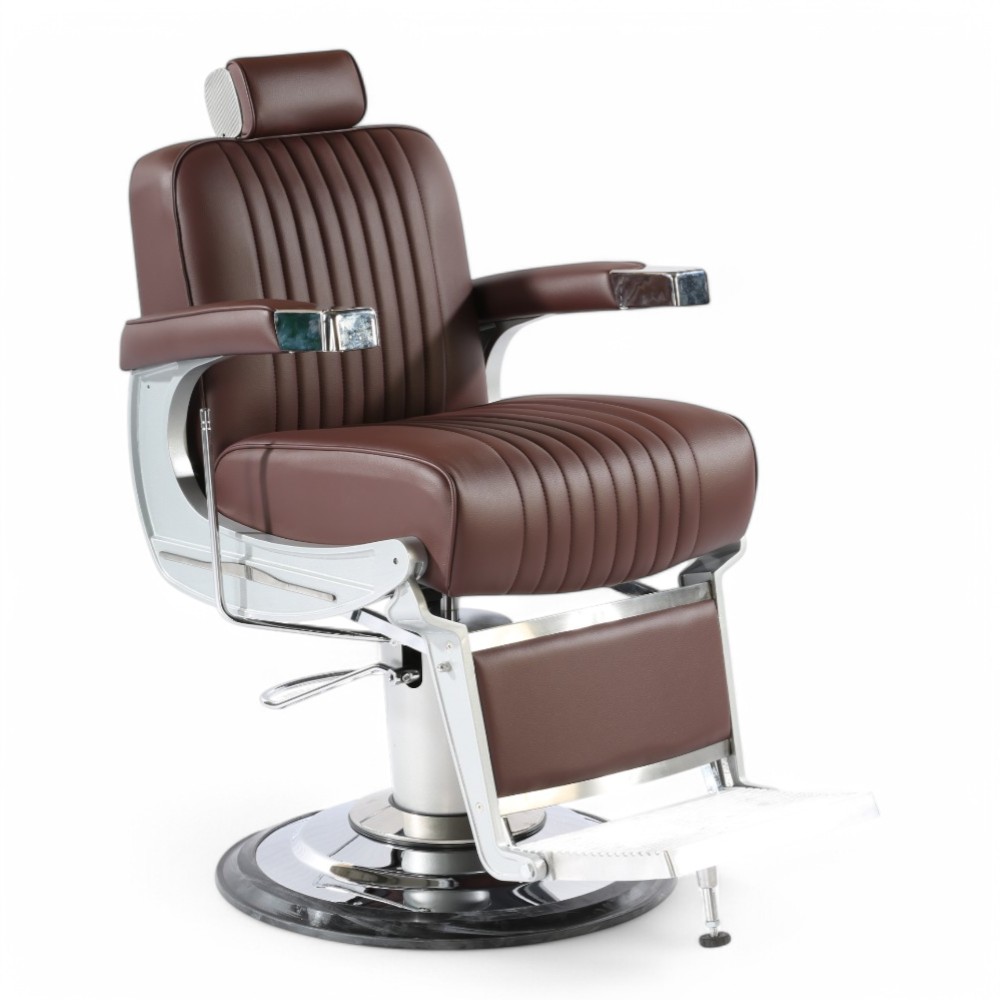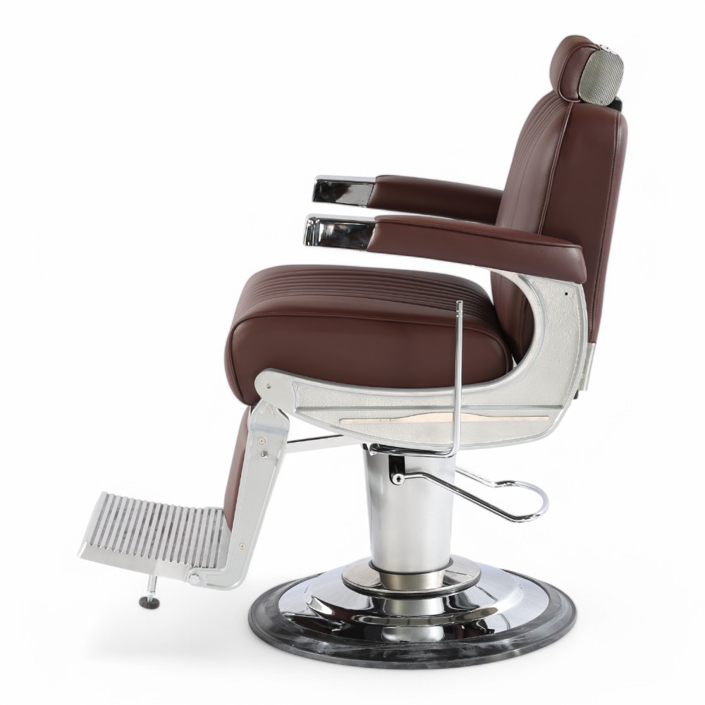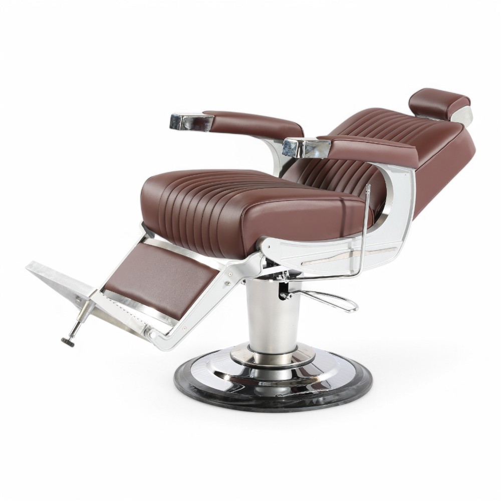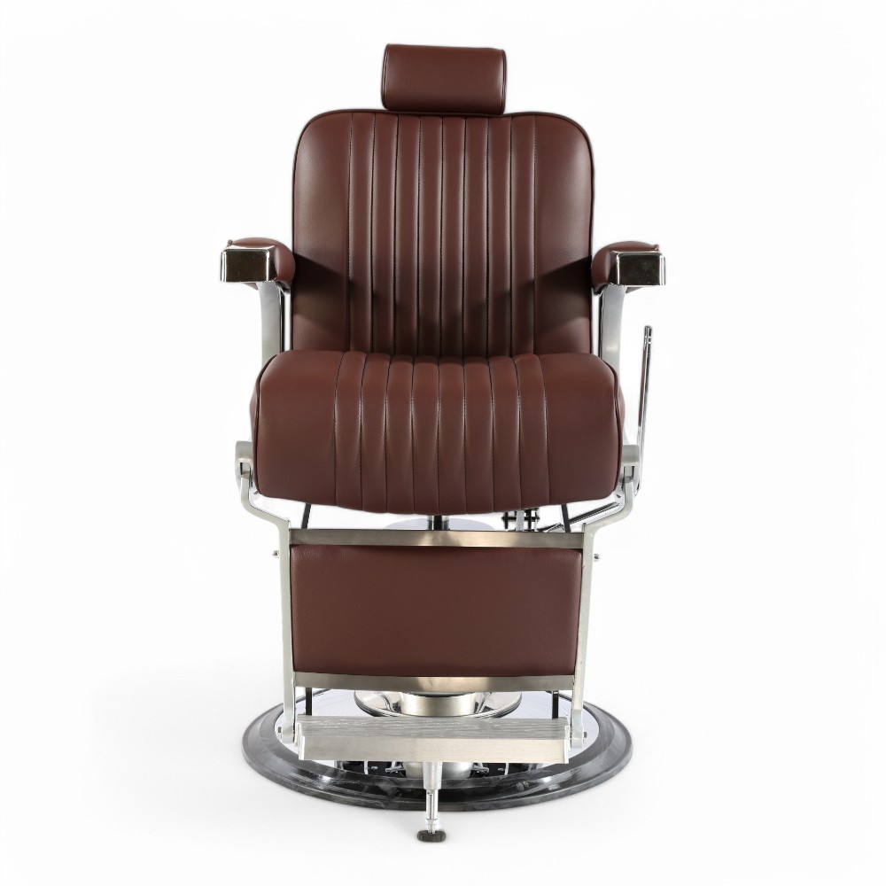Con scocca argentata e rivestimento in similpelle marrone a strisce, la poltrona MUSK.EM unisce design classico e funzionalità per saloni di barbiere di alta classe. La sua struttura robusta offre stabilità e lunga durata, mentre la seduta ampia ed ergonomica, completata dal poggiatesta regolabile, assicura un comfort ottimale ai clienti. Perfetta per ambienti eleganti e professionali. Uno Dei nostri pezzi più pregiati