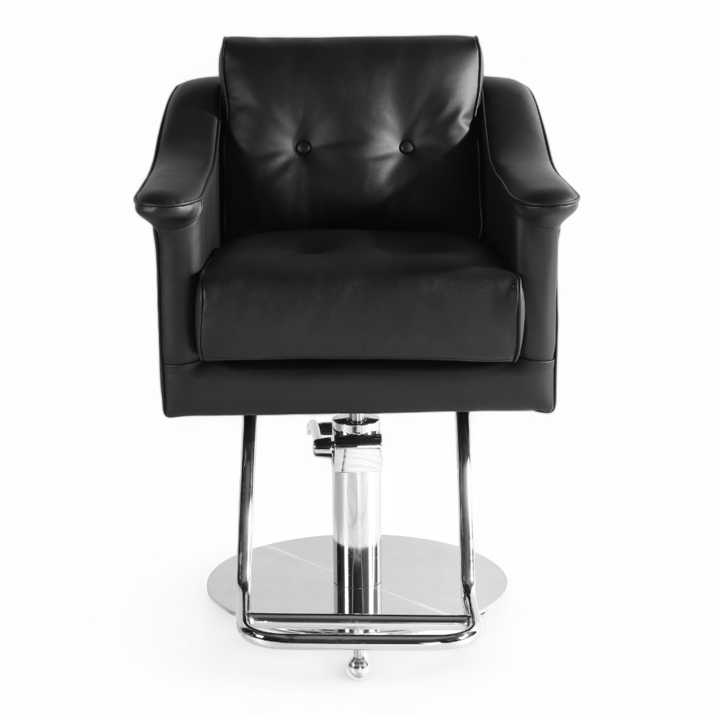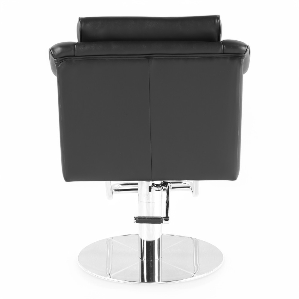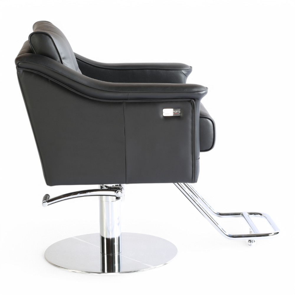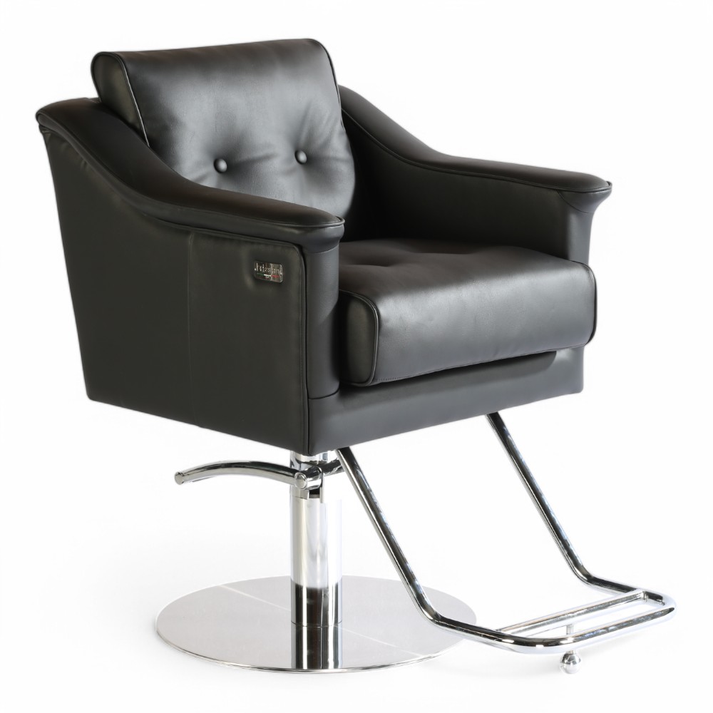 La poltrona NOVA.EM unisce eleganza e comfort grazie al rivestimento in similpelle nera e alla seduta ampia e imbottita. La base cromata solida e il poggiapiedi integrato garantiscono stabilità e praticità, rendendola ideale per saloni moderni e professionali.