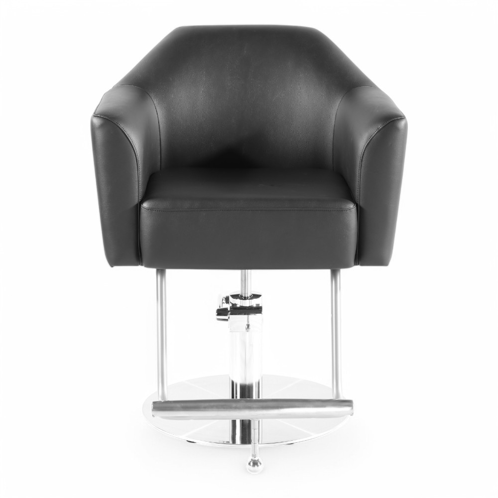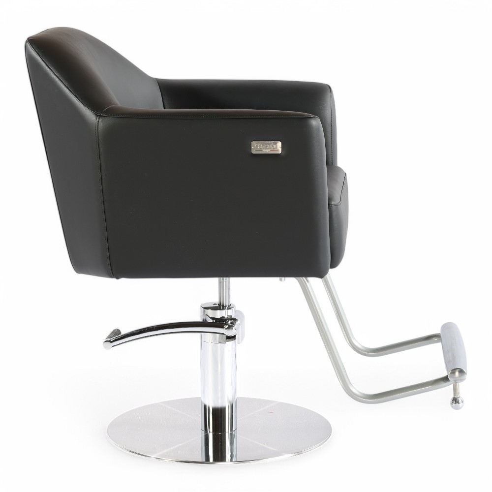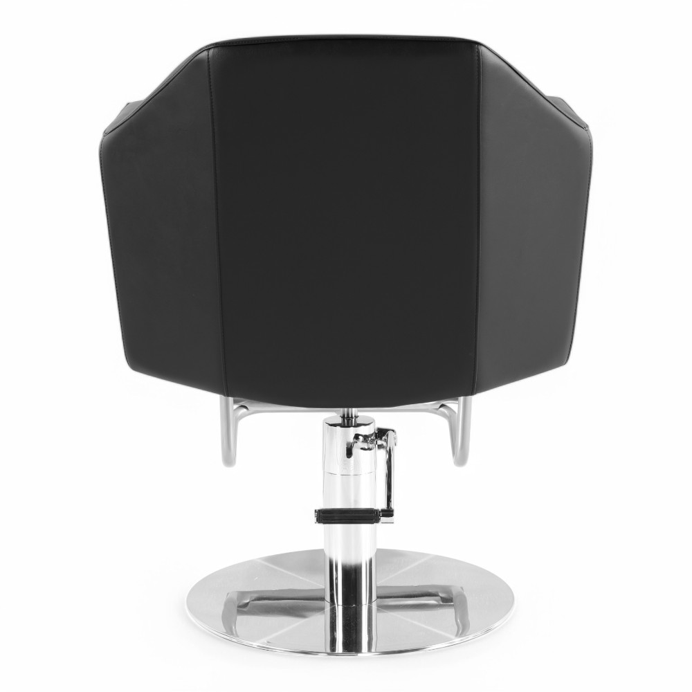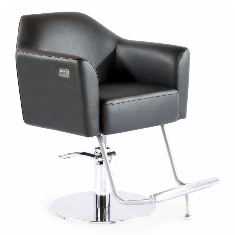 La poltrona TRICK.EM si distingue per il design moderno e minimalista, con linee geometriche e rivestimento in similpelle nera. La base cromata stabile e il poggiapiedi integrato assicurano comfort e funzionalità, rendendola perfetta per saloni contemporanei e professionali.