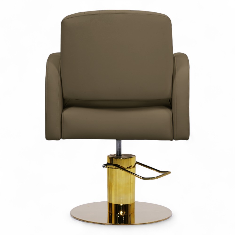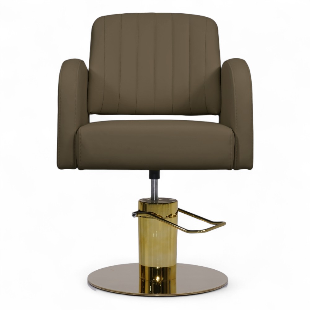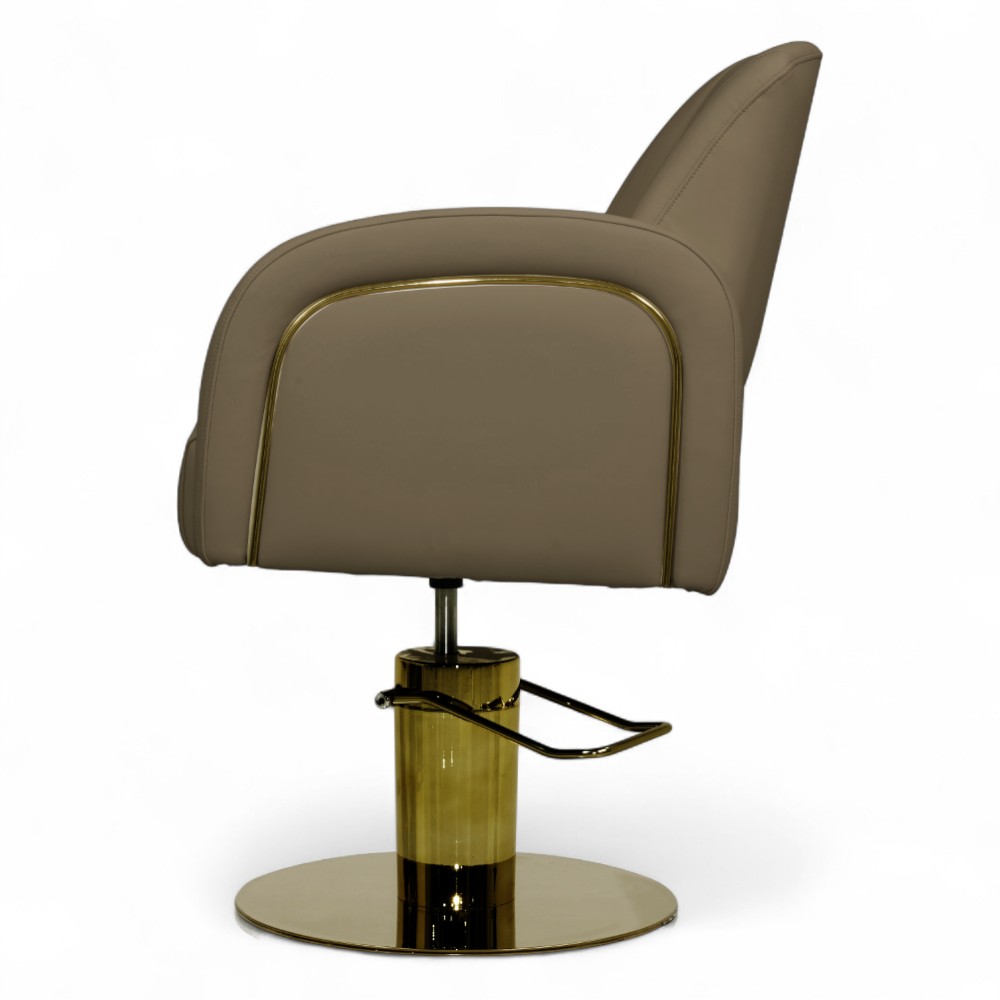 La poltrona ELITE.YC in similpelle marrone scuro, con eleganti inserti dorati, combina comfort e raffinatezza in un design ergonomico. Perfetta per saloni che puntano su un’estetica calda e accogliente, senza rinunciare alla qualità e alla praticità offerte dalla pompa idraulica.