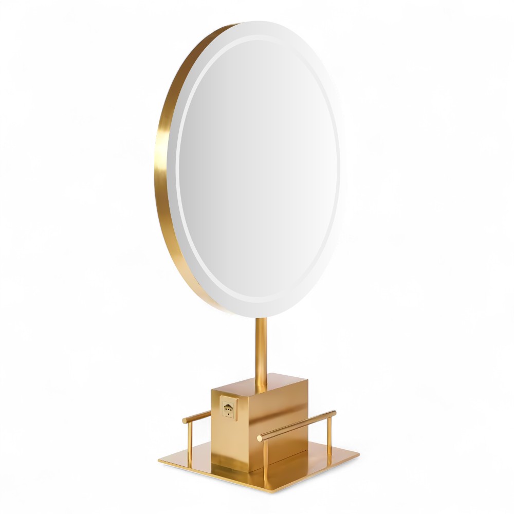 Lo specchio DOMIN.FN si distingue per il suo design elegante e minimalista, caratterizzato da una struttura in Oro con finitura satinata. La base stabile e il supporto integrato lo rendono funzionale e pratico per l'uso quotidiano. Ideale per saloni moderni e professionali, lo specchio DOMIN.FN combina estetica contemporanea e qualità, offrendo un tocco di classe a qualsiasi ambiente.